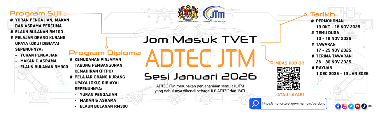 Pusat Latihan Teknologi Tinggi (ADTEC) Batu Pahat tidak bertanggungjawab ke atas apa-apa kehilangan atau kerosakan disebabkan oleh penggunaan maklumat yang diambil dari laman web ini. Kami tidak bertanggungjawab atas sebarang kerosakan atau salah maklumat yang mungkin terjadi dari kandungan yang telah dialih ke bahasa lain. Kandungan rasmi hanya pada laman yang asal iaitu Bahasa Melayu.