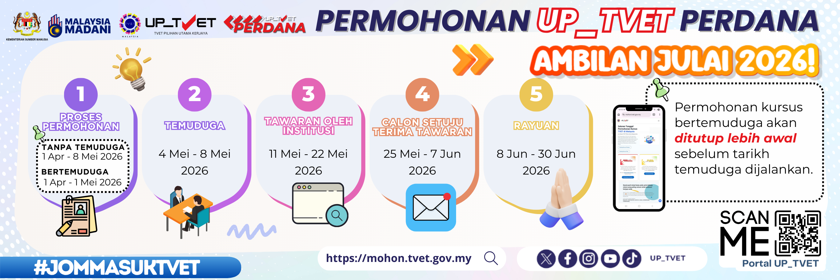 PENGAMBILAN PEAJAR BAHARU SESI JULAI 2026 AKAN DIBUKA MELALUI SALURAN UP TVET BERMULA 1 APRIL 2026